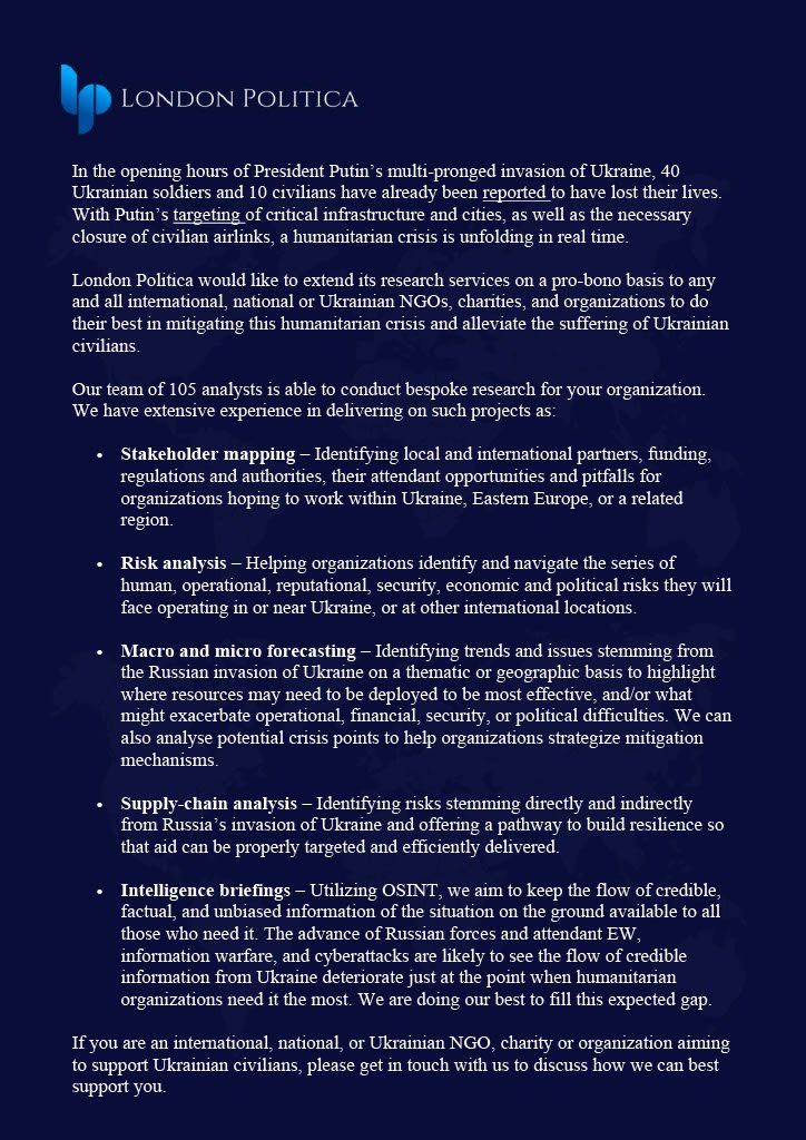 We at London Politica are extending our pro-bono support to any and all NGO's, charities, and organizations aiming to provide humantarian aid in Ukraine in the face of Putin's invasion. If you are one such organization, get in touch via- contact@londonpolitica.com